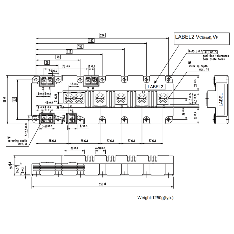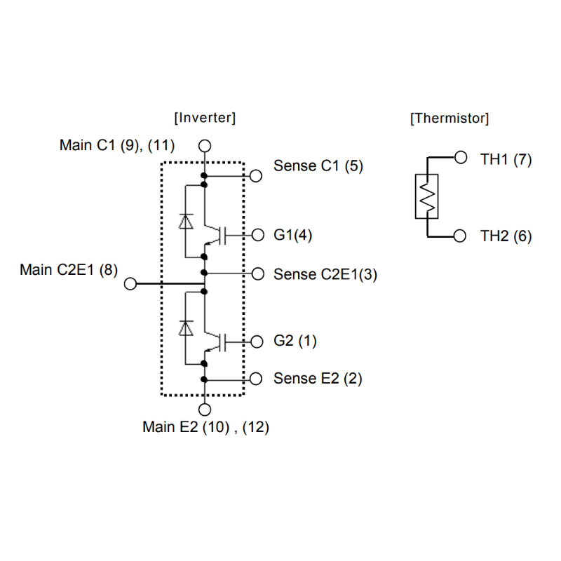 2MBI1400VXB-120P-54 is a high-power IGBT module belonging to the sixth-generation V-series. It has a collector-emitter rated voltage of 1200V, a continuous collector current of 1400A (Tc = 80 °C), a typical saturation voltage drop of 1.70V, and a maximum junction temperature of 175°C. It integrates a low-loss IGBT chip and a freewheeling diode (FWD) and employs a low-inductance module structure, supporting high-speed switching. The module is packaged in an M272 form factor and measures 250 x 89 x 38 mm.